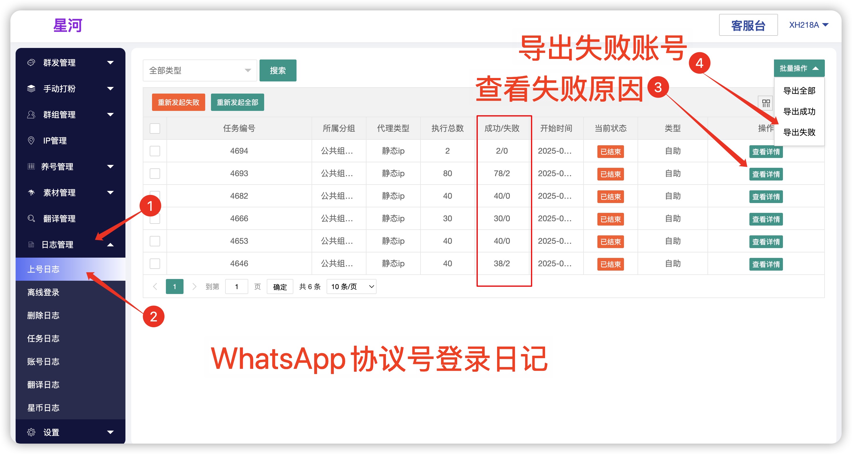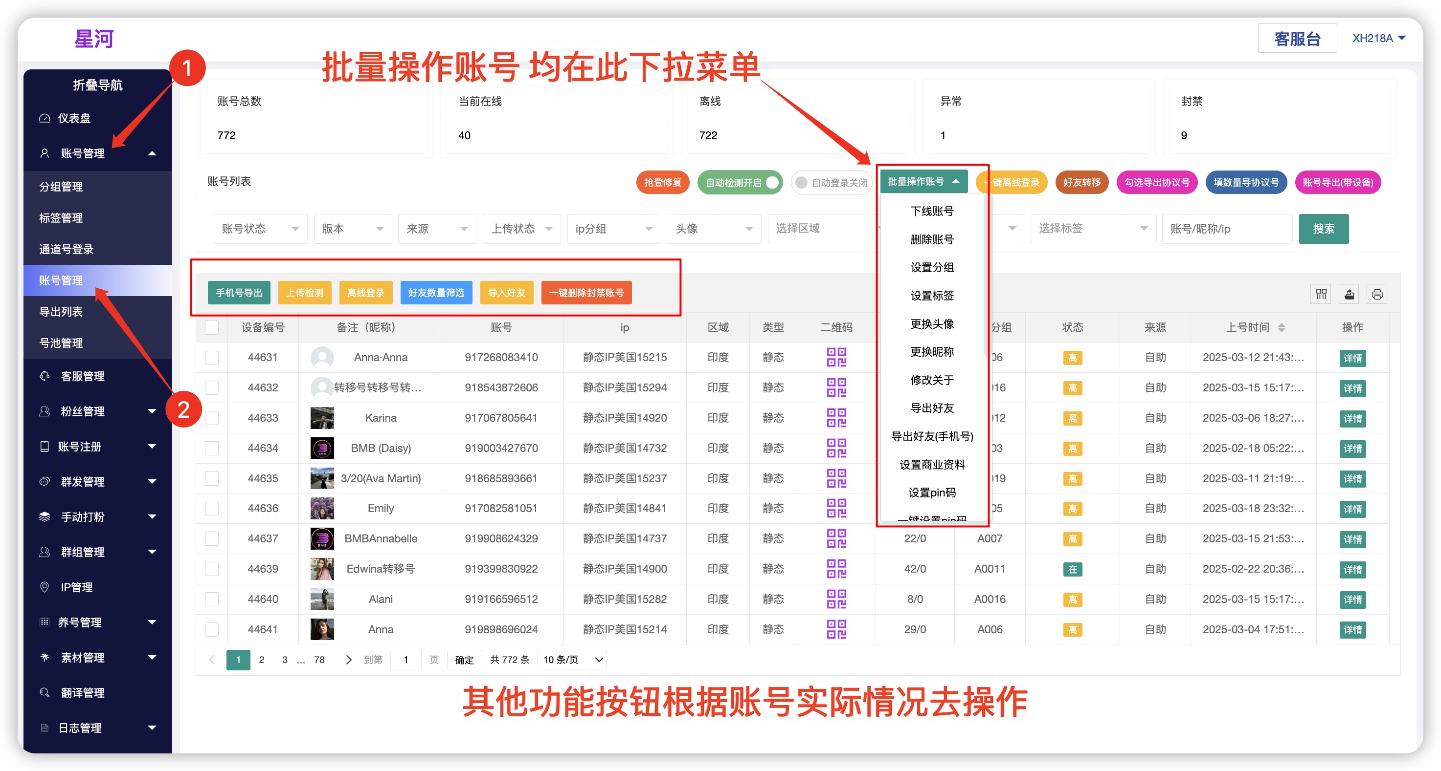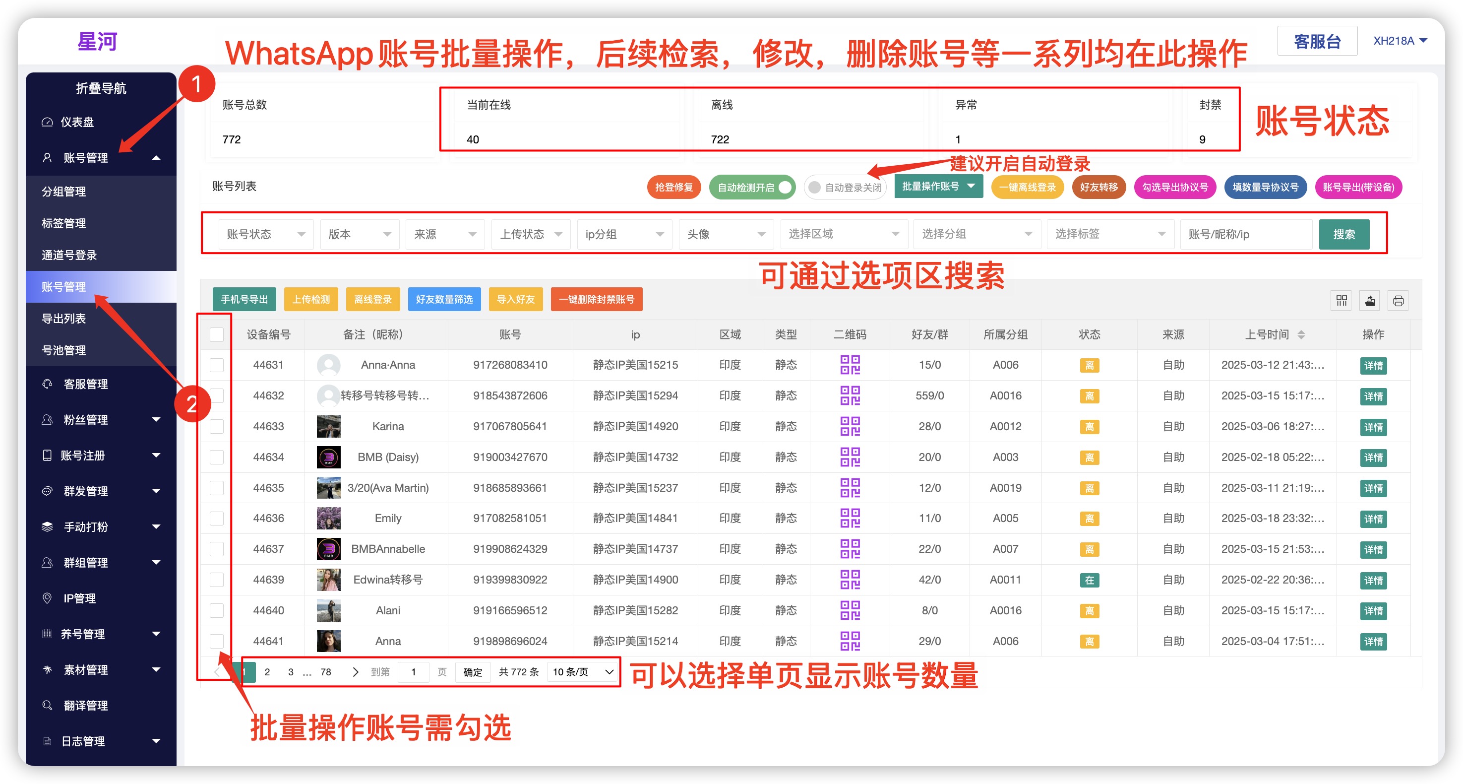 关于 星河云控 ==它是一款最新的Whatsapp真机云控系统,无需手机,真正的免设备云控,支持控上接码注册、养号、接粉、炒群、群发,可开独立后台,自带计数器,自带翻译,批量操作,数据不流失可导入导出,功能齐全,公司全程有白班客服和夜班客服竭诚为大家服务,全程指导✅